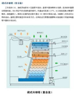 1、閉式冷卻塔實際上是一種蒸發式冷卻塔,冷卻器和濕式冷卻塔的組合,它是臥式的蒸發式冷卻塔,工藝流體在管內流過,空氣 在管外流過,兩者互不接觸。閉式冷卻塔是傳統冷卻塔的一種變形和發展。塔底蓄水池內的水由循環泵抽取后,送往管外均勻地噴淋下來。與工藝式流體熱水或制冷劑和管外空氣并不接觸,成為一種閉式冷卻塔,通過噴淋水增強傳熱傳質的效果。